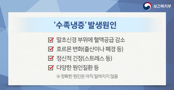 수족냉증은 대개 남성보다 여성, 특히 출산을 마친 여성이나 40대 이상 중년 여성에게서 많이 나타나는 것을 확인할 수 있습니다. 중년 여성에게 많이 발생하는 이유는 여성이 남성과 비교하면 호르몬 변화가 크고 정서적으로 긴장하며 남성보다 민감한 특성이 있기 때문입니다. 수족냉증의 원인은 현재까지 정확히 밝혀지지 않았지만 추위와 같은 외부 자극에 교감신경반응이 예민해지고 혈관이 수축되어 혈액순환을 하지 못하고 지나치게 냉기를 느끼게 된다고 보고 있습니다. 또 혈관에 혈전 같은 찌꺼기가 쌓이거나 잘못된 생활습관, 흡연, 운동부족, 빈혈, 저혈압 출산이나 폐경 같은 호르몬 변화, 스트레스 같은 정신적 긴장 등 다양한 원인을 살펴볼 수 있습니다.