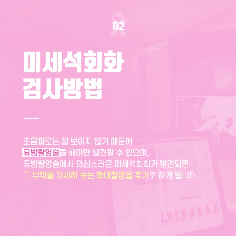 오늘은 ‘유방석회화’에 대해서 알아보도록 하겠습니다.유방석회화는 유방조직 내 칼슘성분 침전물로 평소에는 별다른 증상이 없고 만지지도 않으며 정기검진 시 유방촬영검사에서 작고 흰 반점으로 발견됩니다.