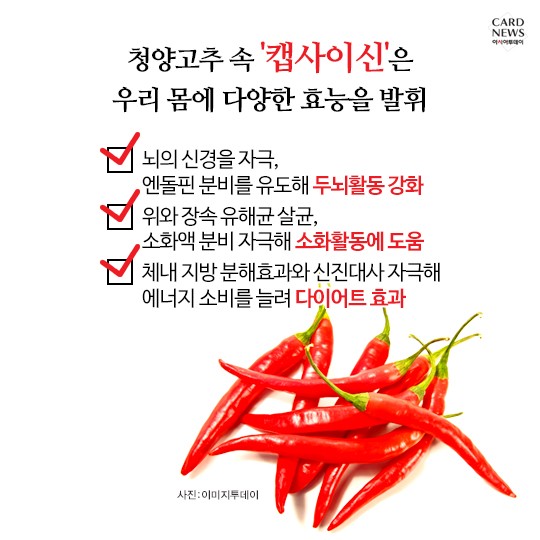 청양고추 효능 암 예방에 도움이 되는 캡사이신 성분이 들어 있기 때문에 이것은 암세포의 발생과 전이를 막아준다고 합니다. 그래서 꾸준히 섭취하시면 암 예방에 효과가 아주 좋습니다.면역력을 높이는 역할도 한다고 합니다. 다이어트에 도움이 되는 몸의 지방을 분해하는 역할을 하는 것으로 알려져 있습니다. 칼로리가 낮아서 다이어트에 효과가 있습니다. 실제로 다이어트 하시는 분들이 잘 챙겨드시면 도움이 된다는 연구 결과도 있다고 합니다.