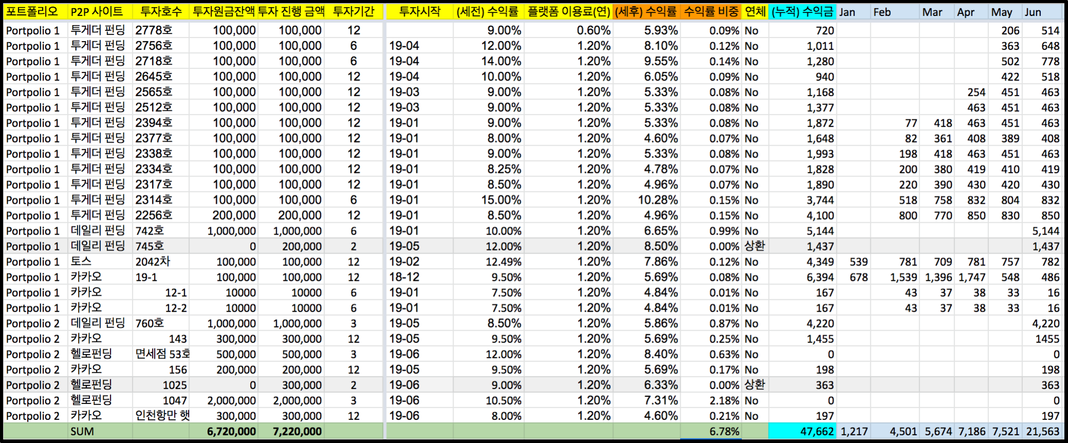 지난 6월에는 1000만원을 상환했고, 신규 투자액은 4500만원에 이르렀다. 지난 6월 HD한국조선해양의 할부판매를 통해 실현된 자금으로 P2P 투자 비중을 높여가고 있습니다. 1월부터 주식을 분할매각해 P2P 투자 자금을 점진적으로 늘리고, P2P 투자 수익도 점차 늘어나는 추세다.